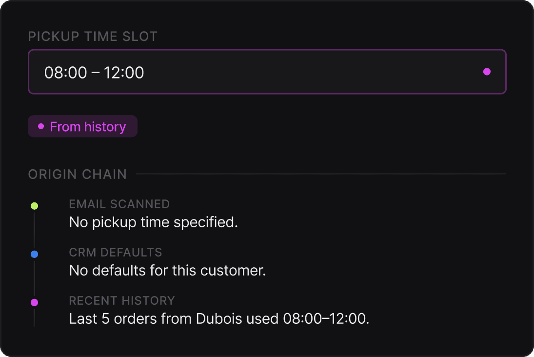 All values and trace back to their origin. The email line, the CRM record, the rule that kicked in. You see the reasoning, not just the result.