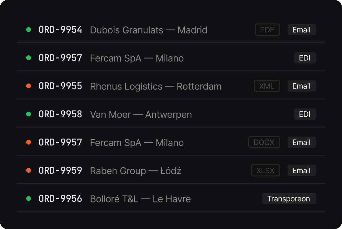 PDF, Excel, email body, portal export. Doesn't matter how your customer sends it. It all lands in one queue, already processed.