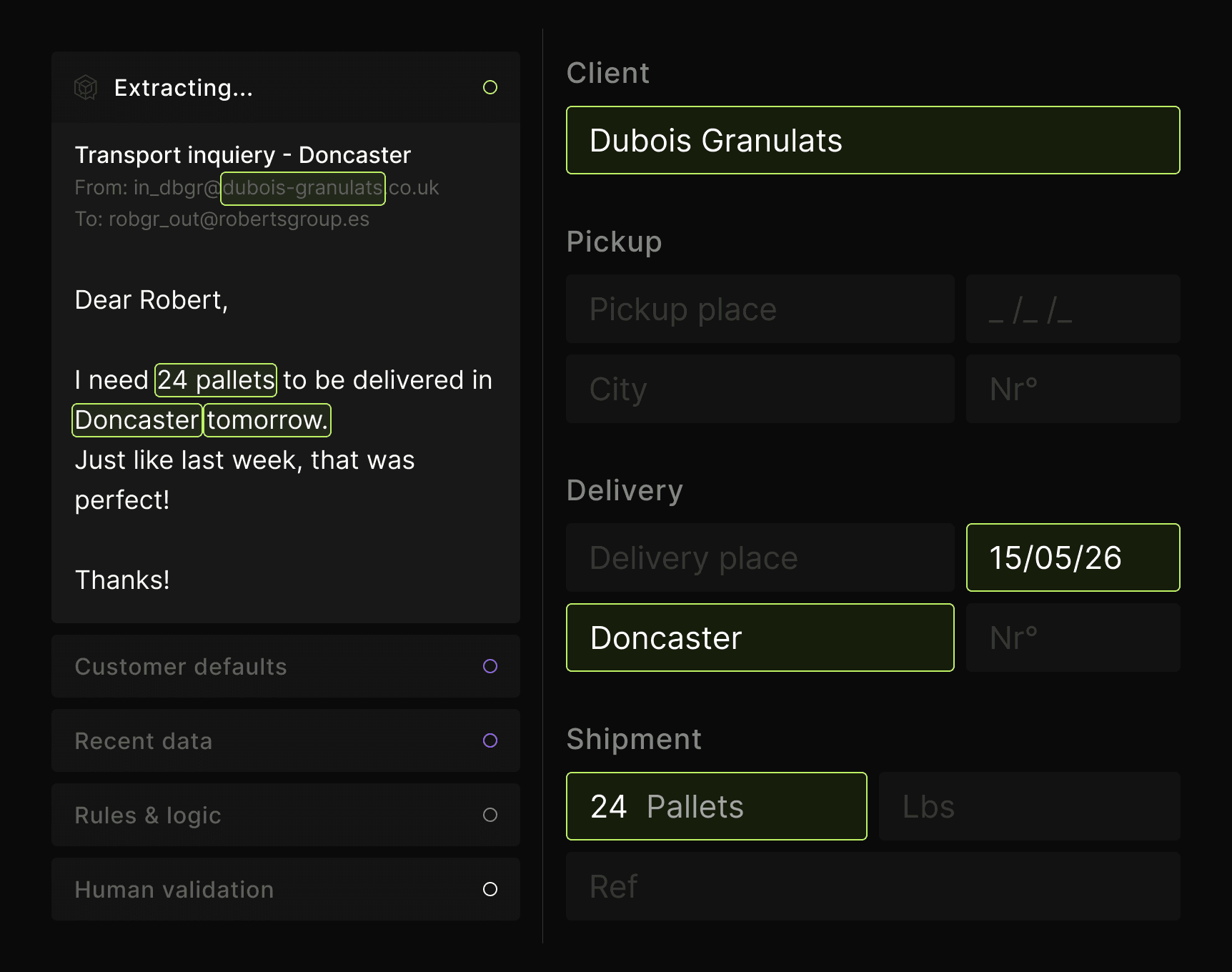 Vectrix checks past orders for the same customer and lane. Missing details get filled from what worked before.