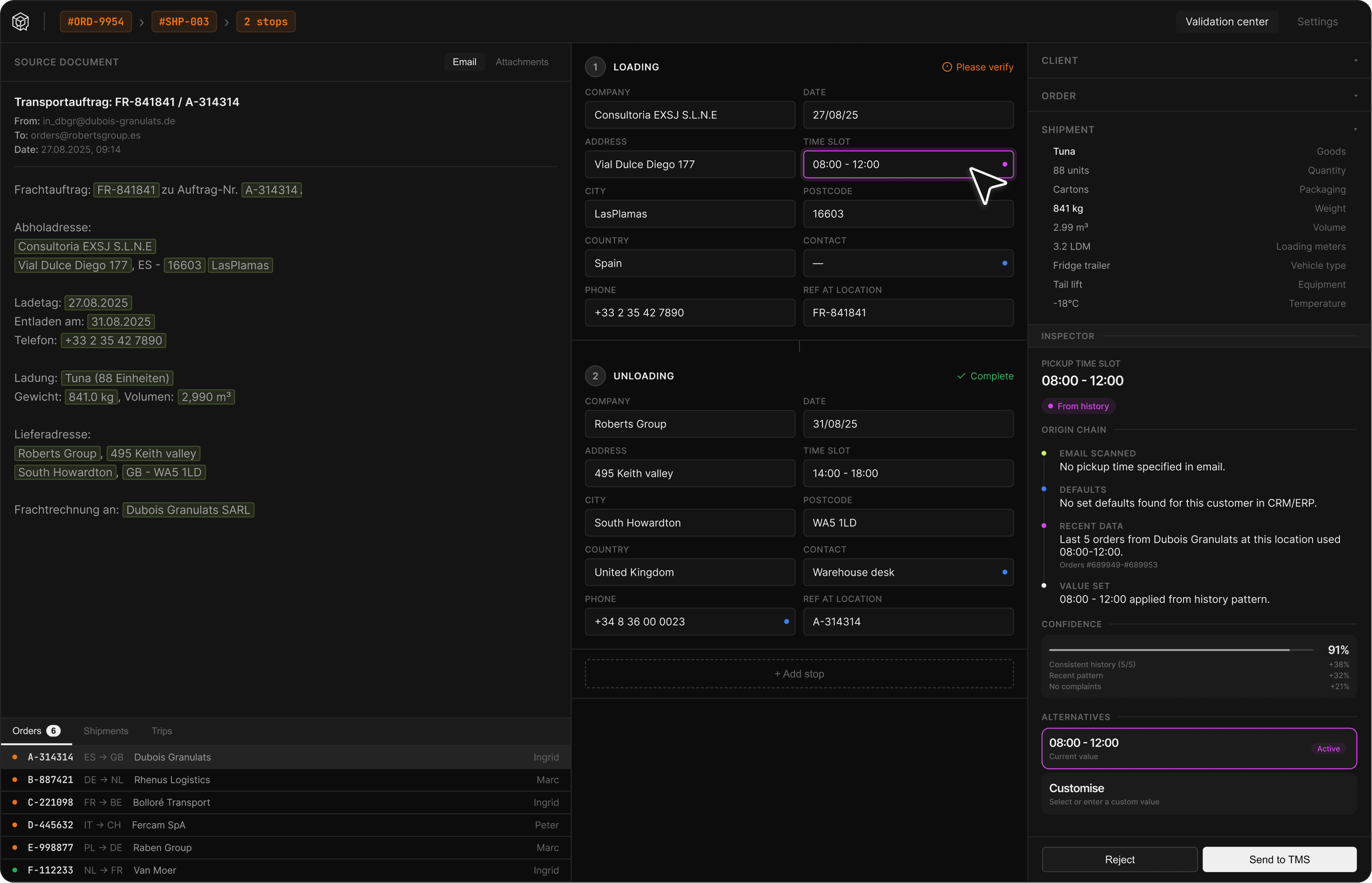 Order is pre-filled. You check, edit if needed, send to TMS. Every correction teaches Vectrix for next time.